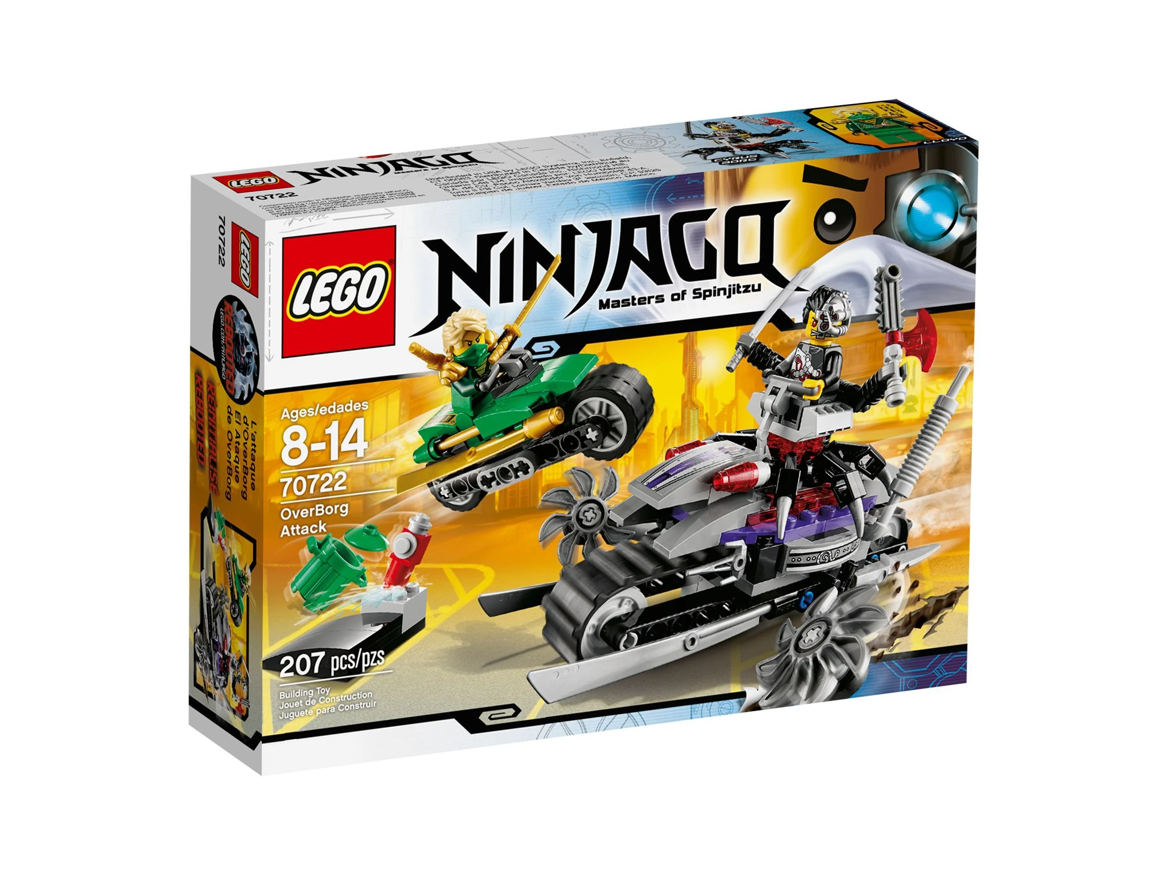 Cyrus Borg wurde durch die Macht der Technik in OverBorg verwandelt und ist besessen von dem Ziel, New Ninjago City unter seine Kontrolle zu bringen und den Grünen Ninja gefangen zu nehmen. Hilf dem Grünen Ninja, sich auf seinem wendigen Motorrad mit goldenen Klingen in Sicherheit zu bringen. Der OverBorg hat in seinem Robo-Sitz Energie getankt. Nun nimmt er auf seinem schweren Gelände-Bike die Verfolgung auf und bereitet seine rotierenden Sägeblätter für den Einsatz vor. Weiche den Laserstrahlen des Gelände-Bikes aus, nimm auf der Rampe an Fahrt auf und springe über OverBorgs furchteinflößende Maschine hinweg! Enthält 2 Minifiguren mit Ausrüstung und Zubehör: OverBorg und Lloyd.