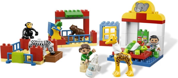 - Besteht aus Behandlungsraum, Fütterungsbereichen, Flasche, Verband, Decke und verschiedenen bedruckten DUPLO Steinen