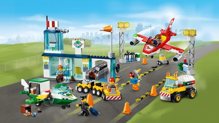 - Inclut également 2 avions avec des bases Starter Brick, un avion-cargo avec des hélices qui tournent et un compartiment cargo, un avion de ligne avec une cage d'escalier, un camion-citerne avec une base Starter Brick et un chariot à bagages avec 2 remorques amovibles.