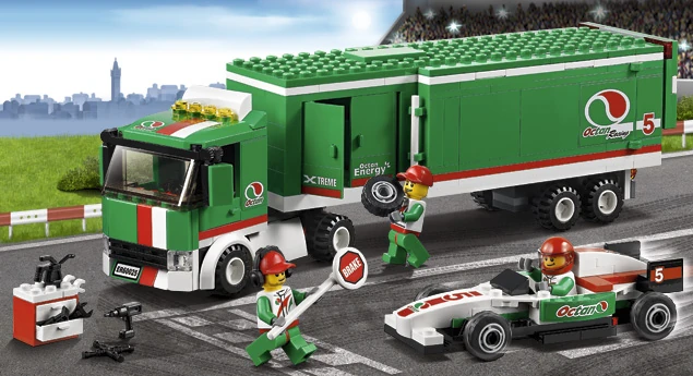 Fais reculer le camion du Grand Prix, ouvre la remorque articulée et décharge la voiture de Formule 1 ultra rapide. Mets vite le pilote au volant et fonce participer à la grande course LEGO City ! En cas de crevaison, aide les mécaniciens du stand à prendre les outils dans la boîte à outils et à changer le pneu ! Fonce hors du stand vers la ligne d'arrivée et gagne la course ! Inclut 3 figurines avec des accessoires : un pilote et 2 mécaniciens de stand.