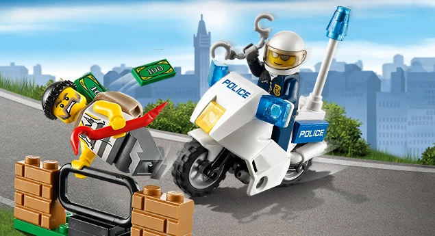 Lance une poursuite LEGO City pleine d'action avec un policier, une moto de police, un mur et une barrière, et un voleur avec un sac-à-dos et de l'argent volé !