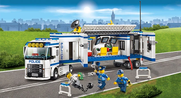 60044 L'unité de police mobile est un ensemble City sorti en décembre 2013. Il contient un camion de police, deux policiers et un voleur. La remorque du camion est amovible de la cabine, peut s'ouvrir pour accéder à un centre de contrôle et dispose d'une prison à l'arrière.