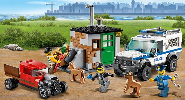 60048 L'intervention de la fourgonnette de police est un ensemble City sorti en décembre 2013. Il contient une cachette, une fourgonnette de police, un hot rod, un policier, deux voleurs, deux chiens et un rat.