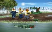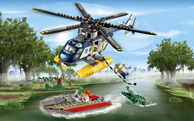 - Comprend un hélicoptère de police, un hors-bord des voleurs, un alligator et une cachette