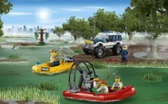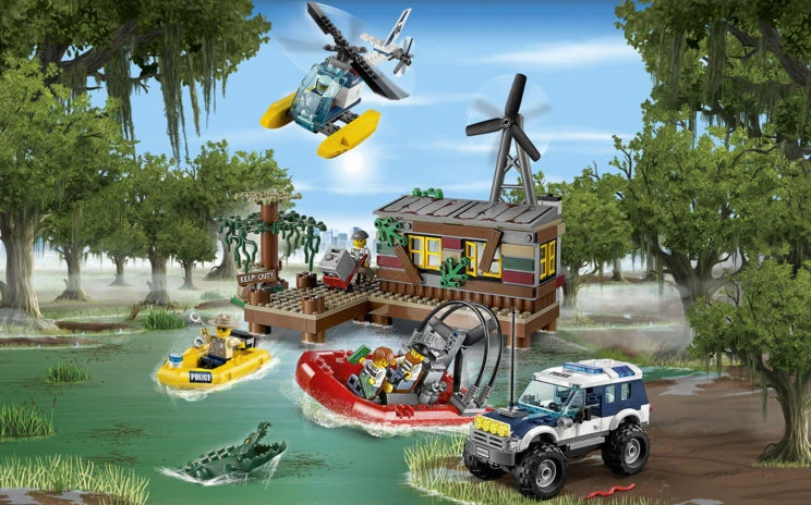 - Comprend un hélicoptère de la police, un 4x4 tout-terrain de la police, un canot de la police, un bateau des bandits, une cachette, un arbre et un alligator