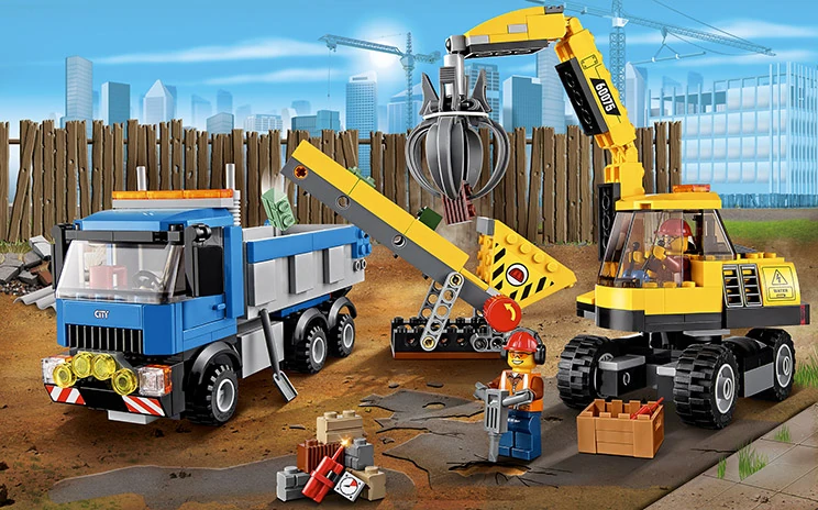 60075 L'excavatrice et le camion est un ensemble City sorti en janvier 2015. Il contient des gravats, une excavatrice, un camion, un tapis roulant et deux ouvriers.