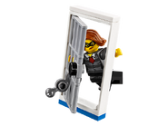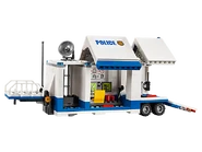 - Le poste de commandement mobile comprend une cabine détachable, une cellule de prison avec une fonction d'évasion et de la place pour deux figurines, une salle de contrôle avec des écrans, une antenne parabolique sur le toit, un bureau, un siège et une zone de stockage pour la moto et des outils à l'arrière de la remorque.