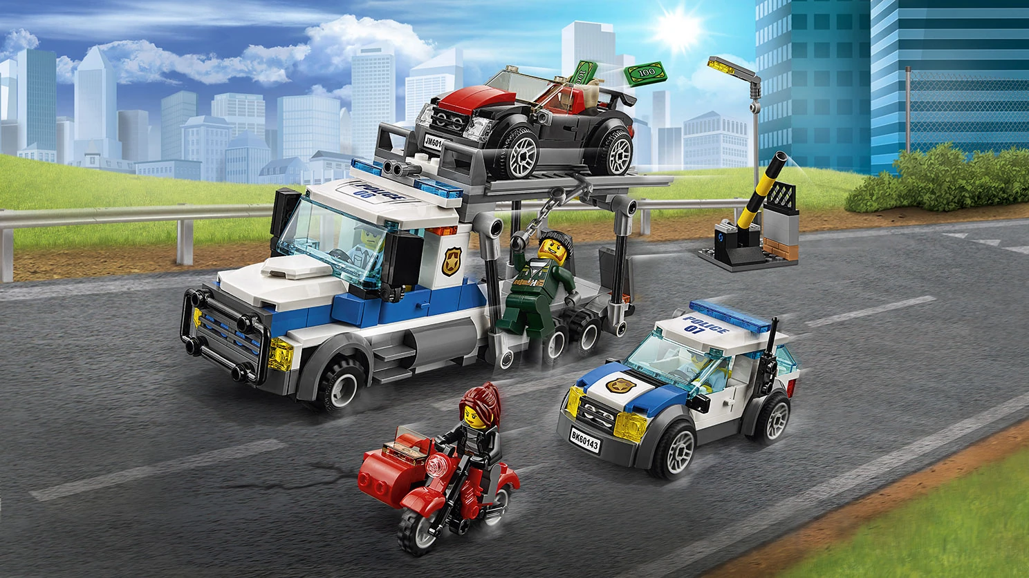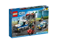 60143 Le braquage du transporteur de voitures est un ensemble City sorti en décembre 2016. Il contient un transporteur de voitures, une voiture de police, une voiture, une moto avec side-car, une barrière, deux policiers et deux voleurs.