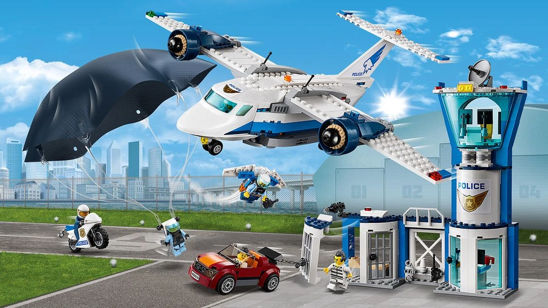 60210 La base aérienne de la police est un ensemble City sorti en décembre 2018. Il contient quatre policiers, deux voleurs, une tour de contrôle de poste de police à trois niveaux, un avion de la police avec une trappe pour lâcher un parachute, un jetpack de police, une moto de police et une voiture d'évasion.