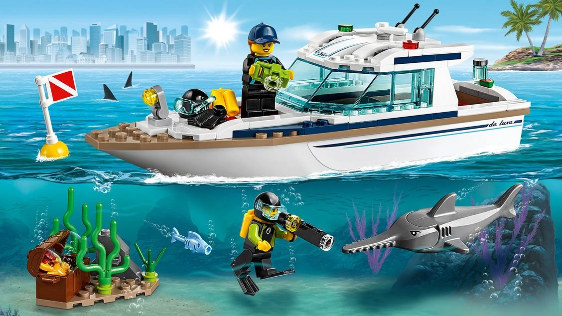 60221 Le yacht de plongée est un ensemble City sorti en décembre 2018. Il contient deux plongeurs, un espadon, un crabe, un poisson, un yacht, une bouée et un coffre au trésor avec un décor de fond marin.