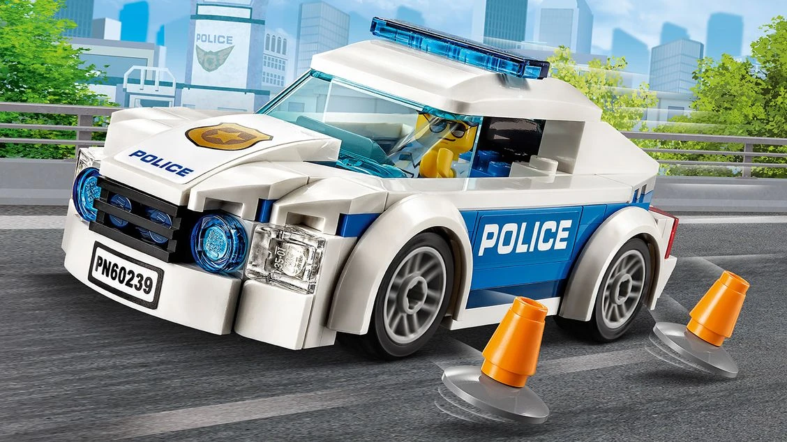 60239 La voiture de patrouille de la police est un ensemble City sorti en décembre 2018. Il contient un policier, une voiture de police et deux cônes de circulation.