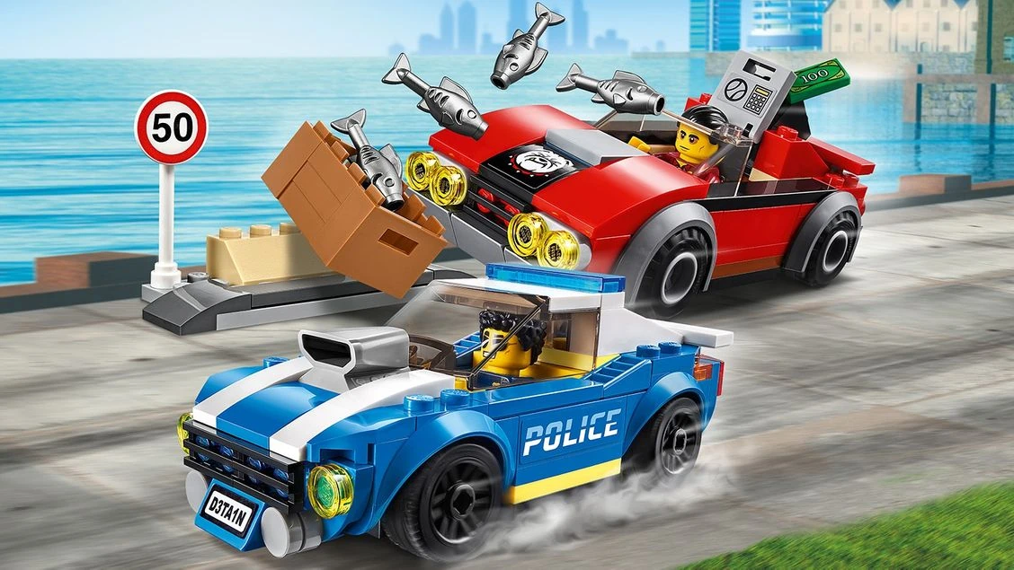 60242 La course-poursuite sur l'autoroute est un ensemble City sorti en janvier 2020. Il contient Duke DeTain, Vito, quatre poissons, la voiture de police de Duke, la voiture décapotable de Vito, un panneau de signalisation et un coffre-fort.