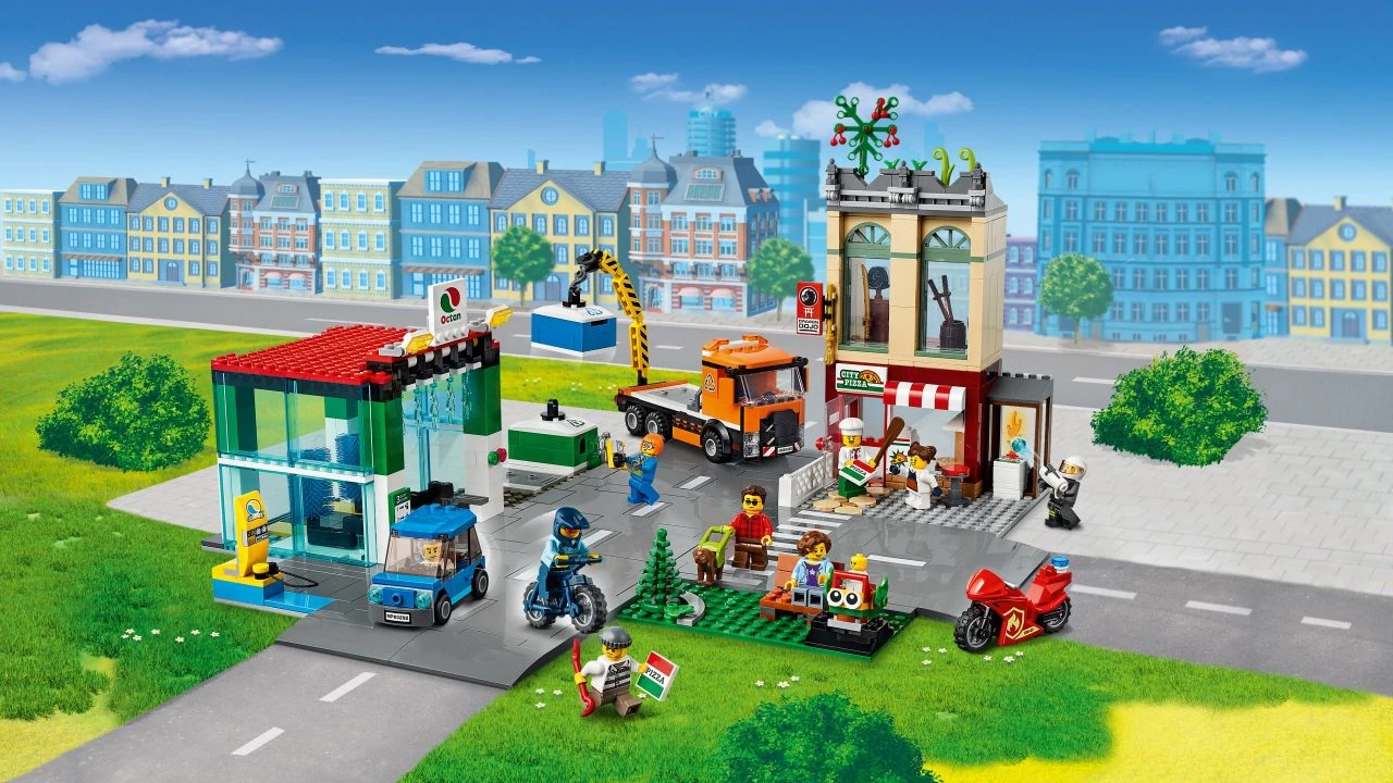 Il y a une pizzeria, une station de recyclage, une station de lavage, une borne de recharge, un dojo, un parc avec des jeux et des personnages amusants de LEGO City. Grâce aux plaques de route incluses, les enfants peuvent le combiner à d'autres sets pour agrandir leur ville au gré de leurs envies !