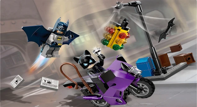 - Comprend la Catcycle de Catwoman, des feux de signalisation, un fouet, un Batarang, des journaux et des cartons