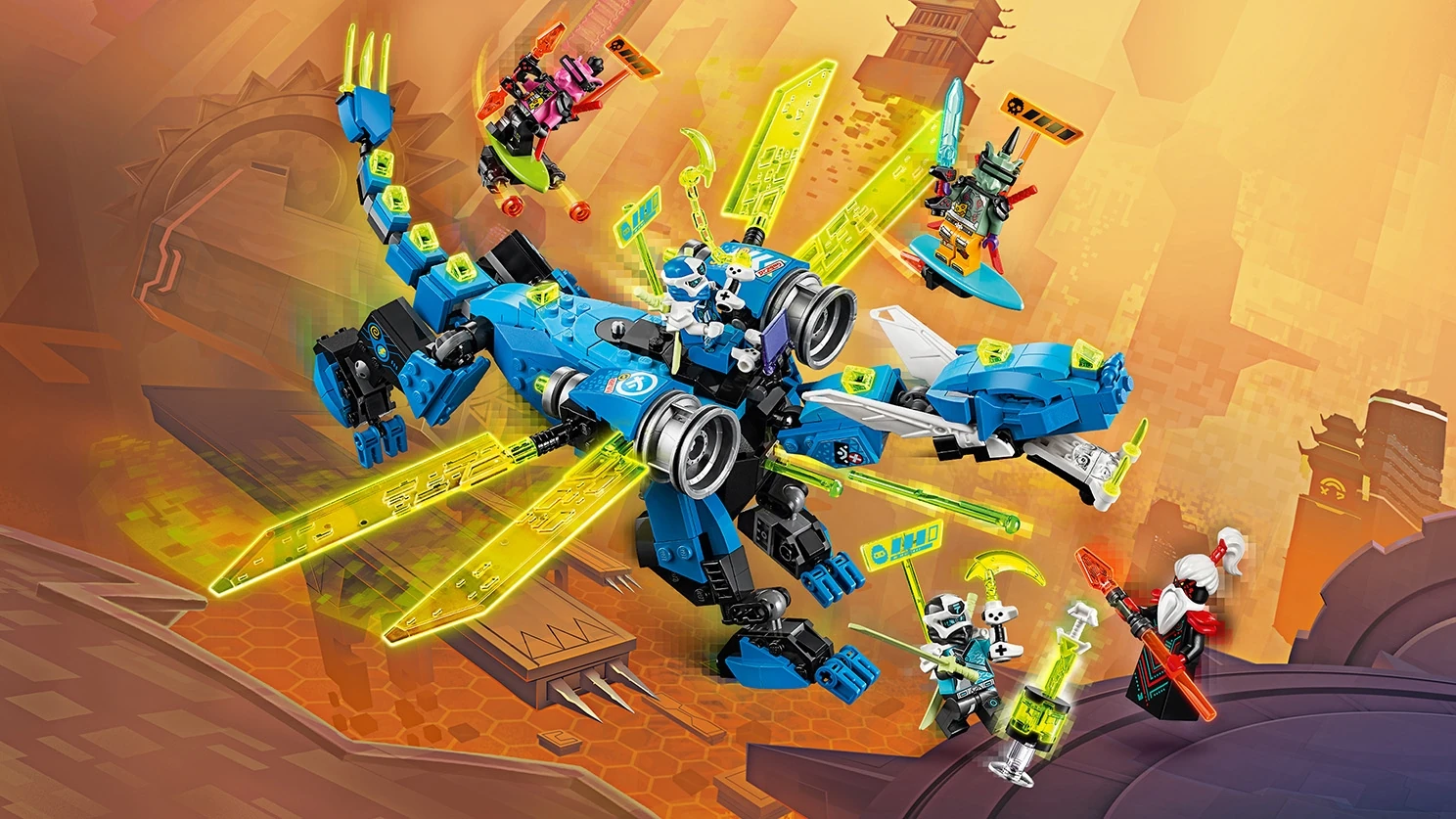 71711 Le cyber dragon de Jay est un ensemble Ninjago sorti en décembre 2019. Il contient Jay, Nya, Hausner, Richie, Unagami, deux hoverboards, un Key-Tana jaune dans son socle, des accessoires et le cyber dragon de Jay.