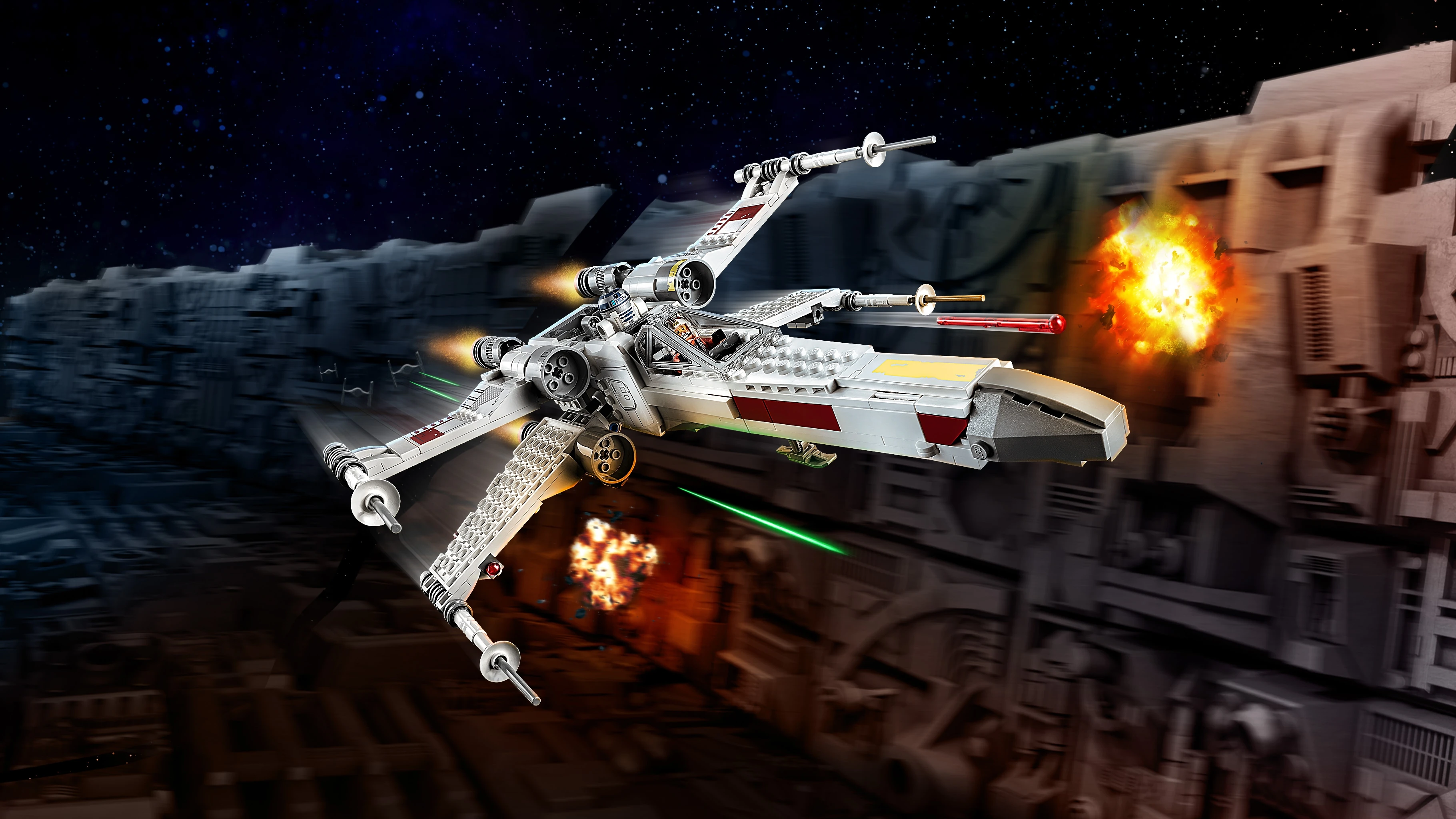 - Le X-Wing dispose d'un cockpit qui s'ouvre pour accueillir une figurine LEGO®, d'un espace pour R2-D2, d'ailes pouvant être mises en position d'attaque en appuyant sur un bouton, d'un train d'atterrissage rétractable et de 2 fusils à ressorts.
