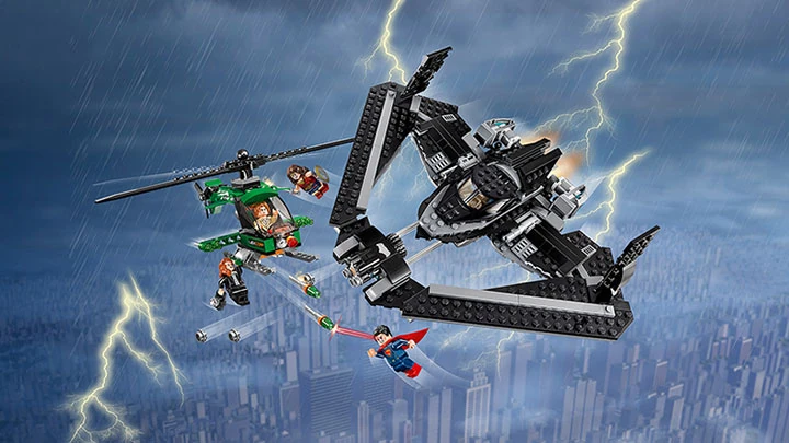 76046 Les Héros de la Justice : la bataille dans le ciel est un ensemble DC Comics Super Heroes Batman v Superman : L'Aube de la Justice sorti en janvier 2016. Il contient Batman, Superman, Wonder Woman, Lois Lane, Lex Luthor, le Batwing et un hélicoptère LexCorp.