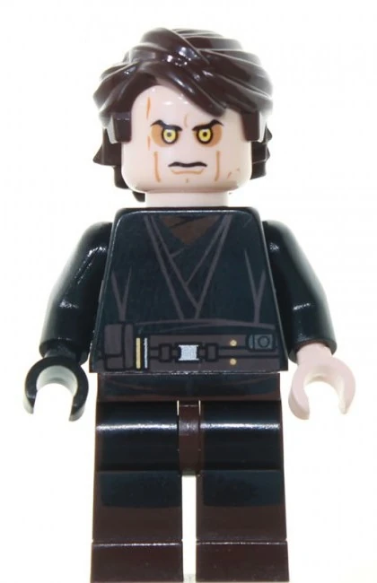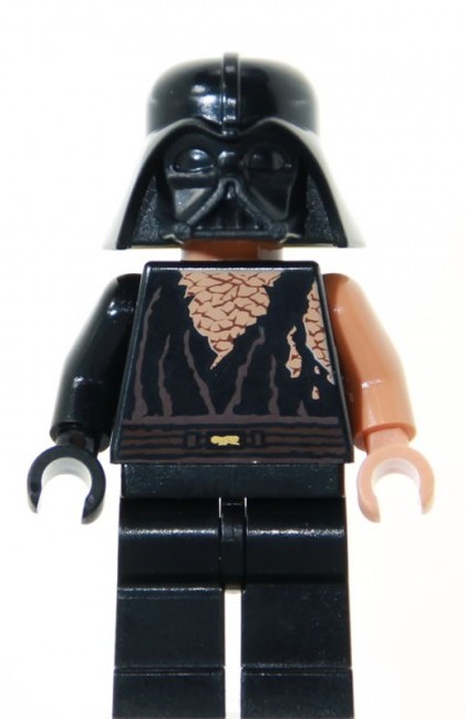 Episode III: Revenge of the Sith | vleeskleurig gezicht, met rode littekens links en rechts en onder zijn ogen, zonder haar, met zwart/bruin gehavend shirt, vleeskleurige linkerarm en -hand, zwarte rechterarm- en hand en zwarte benen, met Darth Vader helm | ||