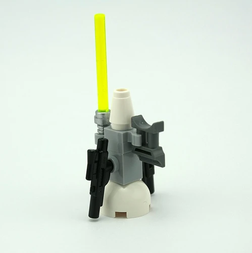 Każdy żołnierz potrzebuje broni i innego wyposażenia. Tutaj znajdziemy dwa blastery, skaner, a nawet miecz świetlny w kolorze zielonym. Wszystko jest zamontowane na specjalnym stojaku.