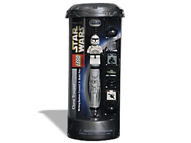 Este set contém uma caneta com uma peça parecida com uma minifigura de um Clone Trooper.
