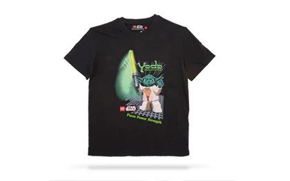 Este set camiseta contém uma camisa preta com uma estampa do Mestre Jedi Yoda.