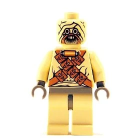 Esta minifigura tem pernas beges, corpo bege com desenho de suas roupas e cabeça de Povo da Areia.