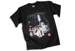 Este set contém uma camiseta preta com uma estampa com a capa do videogame LEGO Star Wars II: The Original Trilogy.