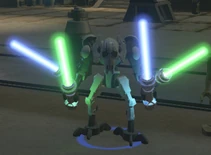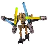 Генерал Гривус во время Войны клонов командовал армией дроидов Сепаратистов. Когда-то он был воином-калишцем с телом из плоти и крови, но стал завидовать силам джедаев и решил превратиться в киборга, чтобы увеличить свою боевую силу и скорость. Способность владеть сразу четырьмя световыми мечами делает его грозным противником даже для прекрасно подготовленных рыцарей-джедаев. |