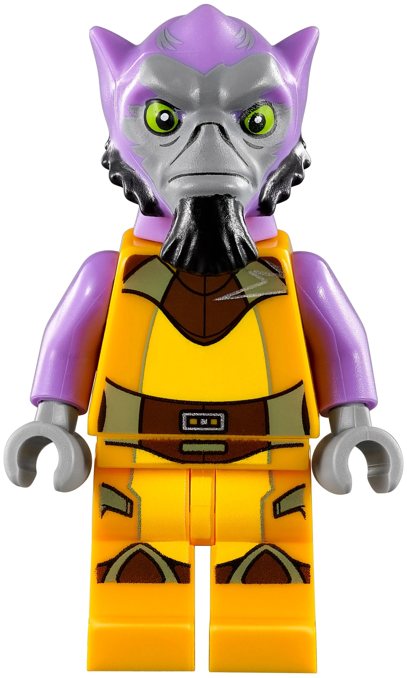 Зеб обладает уникальной деталью головы светло-фиолетового цвета: на ней выделены большие уши, чёрные бакенбарды и бородка, а с помощью принтов изображены светло-серое лицо, зелёные глаза, длинные ноздри и рот. Зеб одет в ярко-жёлтый костюм без рукавов с коричневыми элементами: бронёй на груди, широким поясом и наколенниками. Из аксессуаров к минифигурке прилагается посох-винтовка, состоящий из двух чёрных бластеров, соединённых концами посредством рукоятки светового меча.