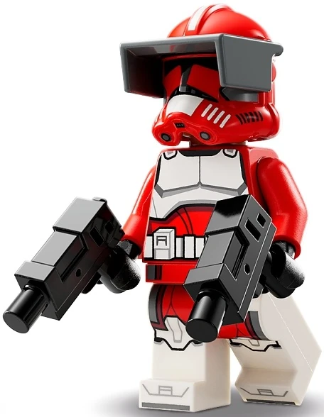 Коммандер Фокс носит универсальную броню из белых пластин, защищающих всё тело, и тёмно-красный пояс поверх чёрной ткани, видной на кистях и в районе пояса. Руки тоже окрашены в тёмно-красный, а на туловище нанесён узор в виде эмблемы Корусантской гвардии. Шлем первой фазы имеет соответствующий раскрас на гребне, щеках и подбородке. Дополнительно к броне добавлены пластиковая кама у ног и дальномер на шлеме.