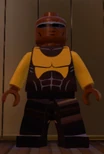 Афроамериканец Силач носит жёлтую футболку, под которой видны мышцы, с низом чёрного цвета, переходящего в брюки, а также тёмные очки.