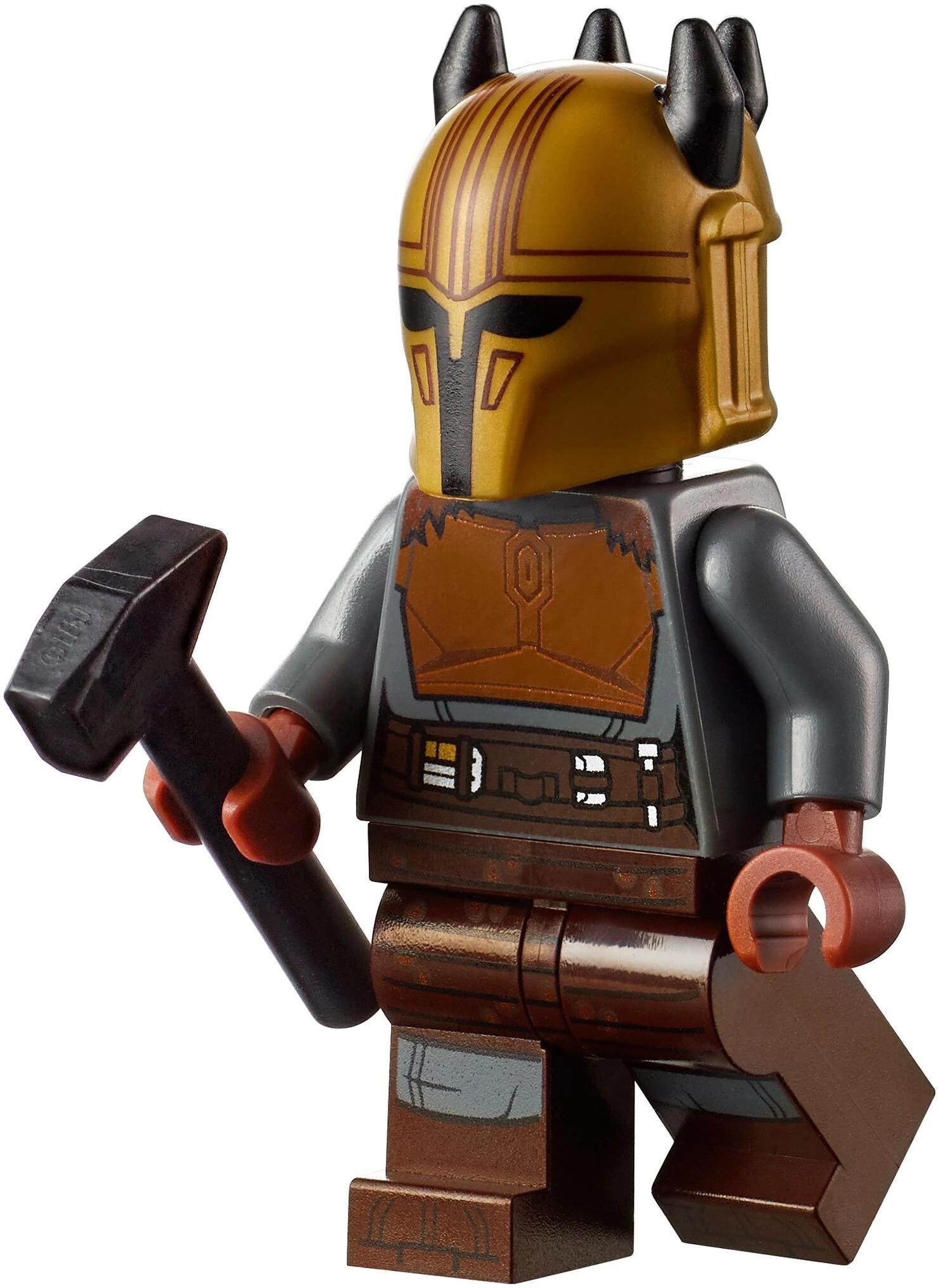 Мандалорка-кузнец носила цельную коричневую пластину брони на серой основе с меховым воротником, коричневый кожаный килт с поясом поверх серых штанов, а также коричневые перчатки и ботинки. На золотой детали шлема с четырьмя короткими чёрными рожками напечатан Т-образный визор с округлыми прорезями у глаз и продольные линии на "куполе". Фигурке не досталось собственного лица, и вместо него под шлемом находится обыкновенная чёрная деталь головы.