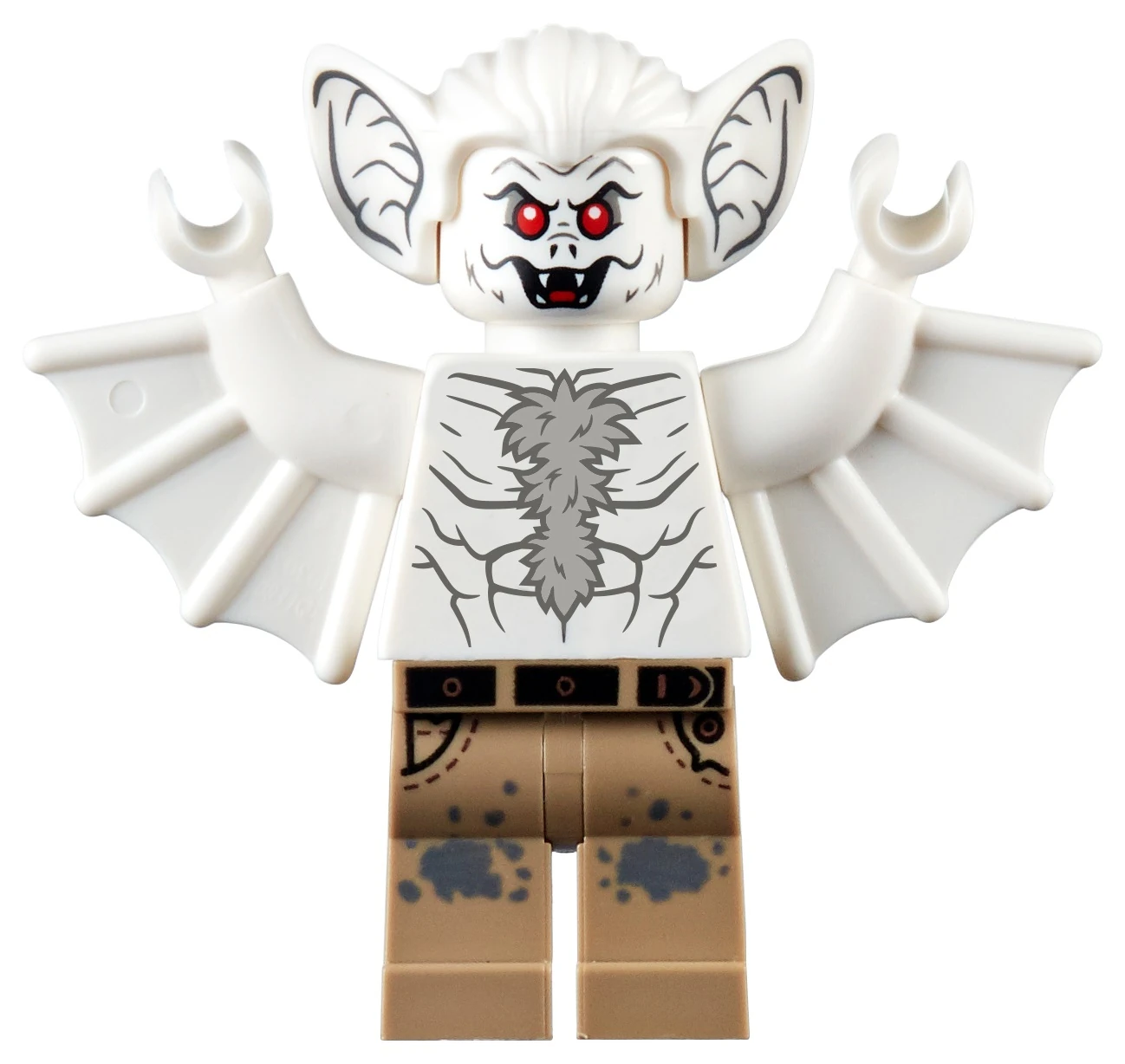 Мен-Бэт состоит из коричневого торса со специальными деталями поднятых рук с крыльями-перепонками, головы с раскрытой пастью и красными глазами, единой детали волос и больших ушей, плюс синих штанов.