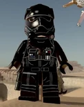 Ноги, руки, кисти и торс минифигурки полностью чёрные. На ногах и на торсе присутствуют принты брони пилота. На голову пилота одет чёрный шлем, к которому присоединяется дыхательная трубка.