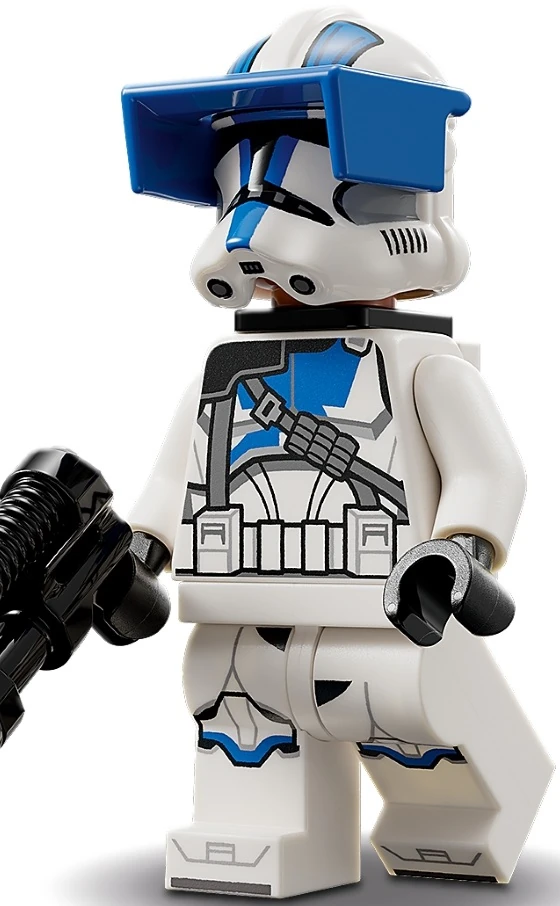 Клон-солдат носит универсальную броню из белых пластин, защищающих всё тело, и пояс поверх чёрной ткани, видной на кистях и поясе. Шлем второй фазы округлый, с расширенной у глаз линзой и коротким дыхательным аппаратом, в нижнюю часть с двух сторон встроены широкие трубки-фильтры; поверх линзы прикреплён синий визор. По нагрудной пластине проходит утолщённая полоса синего цвета с разветвлёнными концами, по шлему - полоса потоньше и две бронированные полоски по сторонам центрального гребня; таким же цветом 501-го легиона отмечены колени. На правом плече торса напечатан серый наплечник с вертикальным ремешком до пояса и диагональным патронташем; на спине помещён рюкзак в виде плитки 1х1 с принтом эмблемы Республики.
