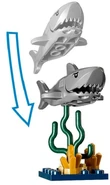 Три минифигурки: Аквамен с трезубцем, Мера со стреляющими зарядами, Чёрная манта с мечом, плюс фигурка акулы