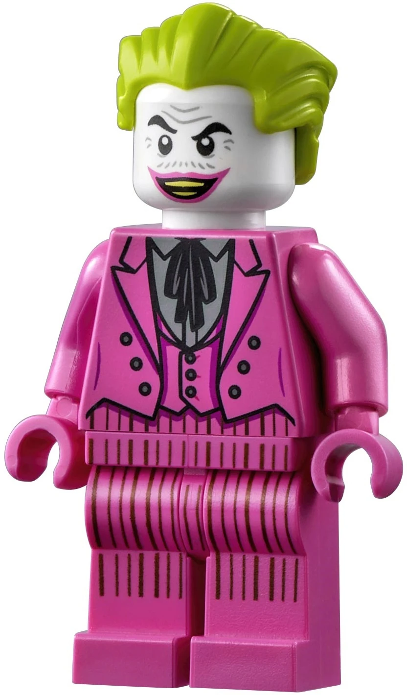 - В набор входит сборная модель Бэтмобиля, которую можно собрать с шипометами или без них, а также минифигурки Бэтмена и Джокера в классическом стиле 1960-х годов и вращающаяся подставка.
