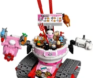 - У игрушечного танка есть кухня с элементами еды и спрятанный в холодильнике дискомет, шестизарядный скорострельный шутер в виде свиньи, вращающаяся миска для лапши, две съемных палочки для еды и движущиеся грабли спереди.